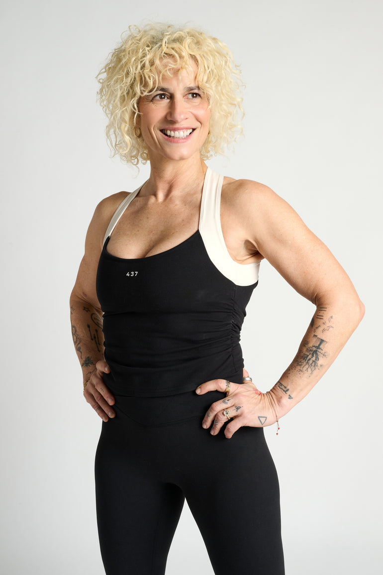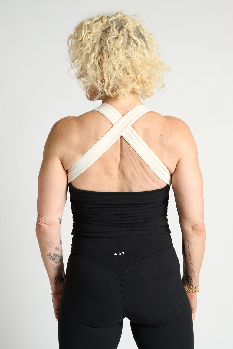 The Sculpt Tank features thick criss-cross straps, flattering side ruching, and a built-in bra with removable padding for customizable support. Finished with a subtle 437 logo at the center front and crafted from moisture-wicking recycled polyester, it’s designed to keep up with you.