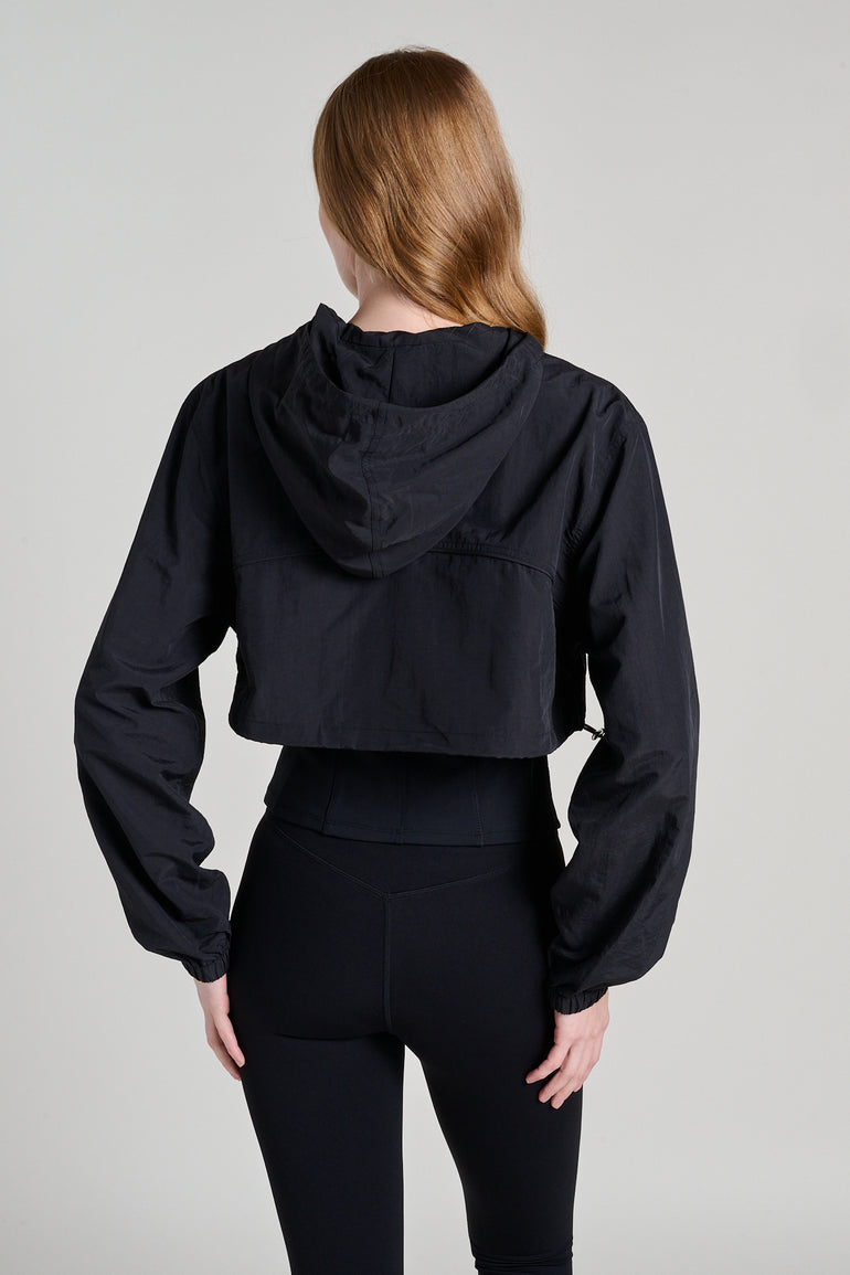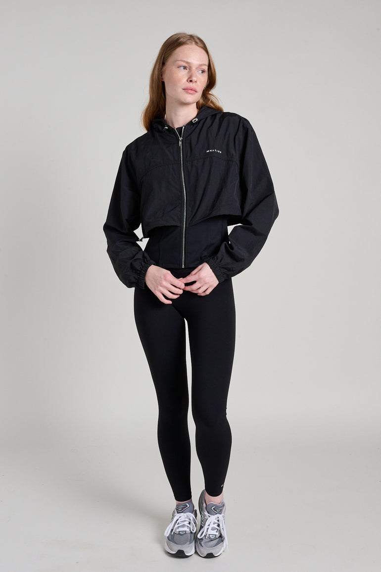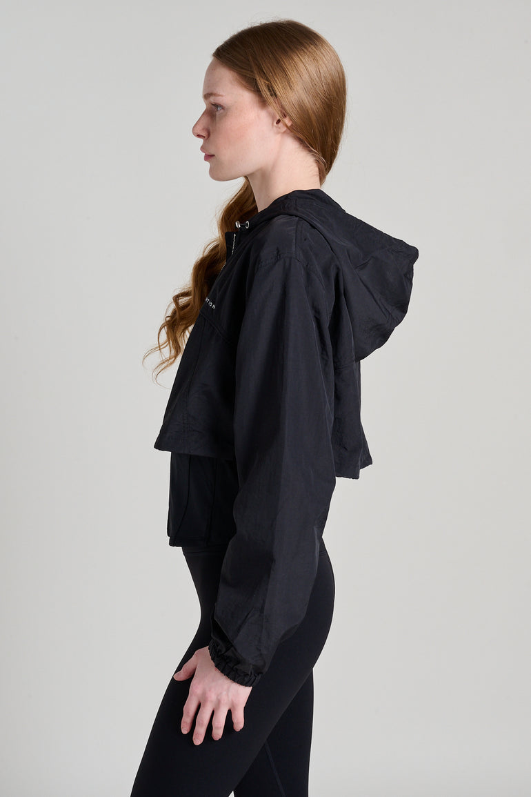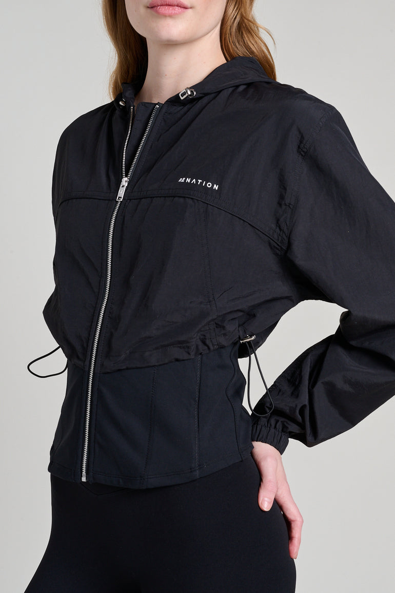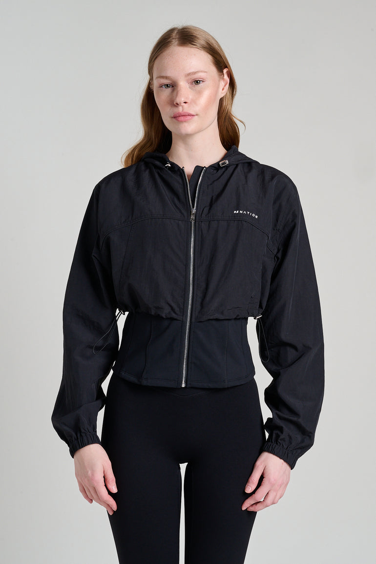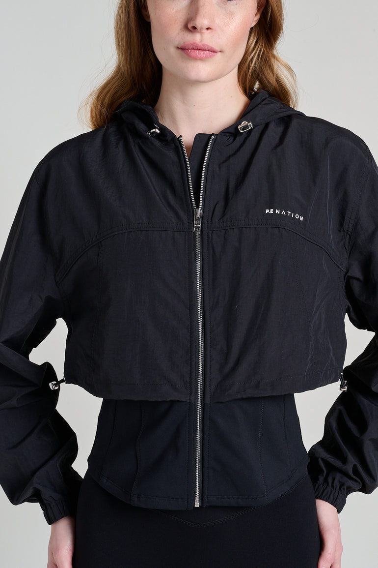 The Dash Jacket is made from P.E Nation's Spray fabrication, a lightweight, wind-resistant shell with a sleek matte finish. Featuring a layered design with a fitted inner, front zip, hood with drawcord toggles, and adjustable hem, it delivers structure and versatility. Pair it with activewear for an effortless off-duty look.