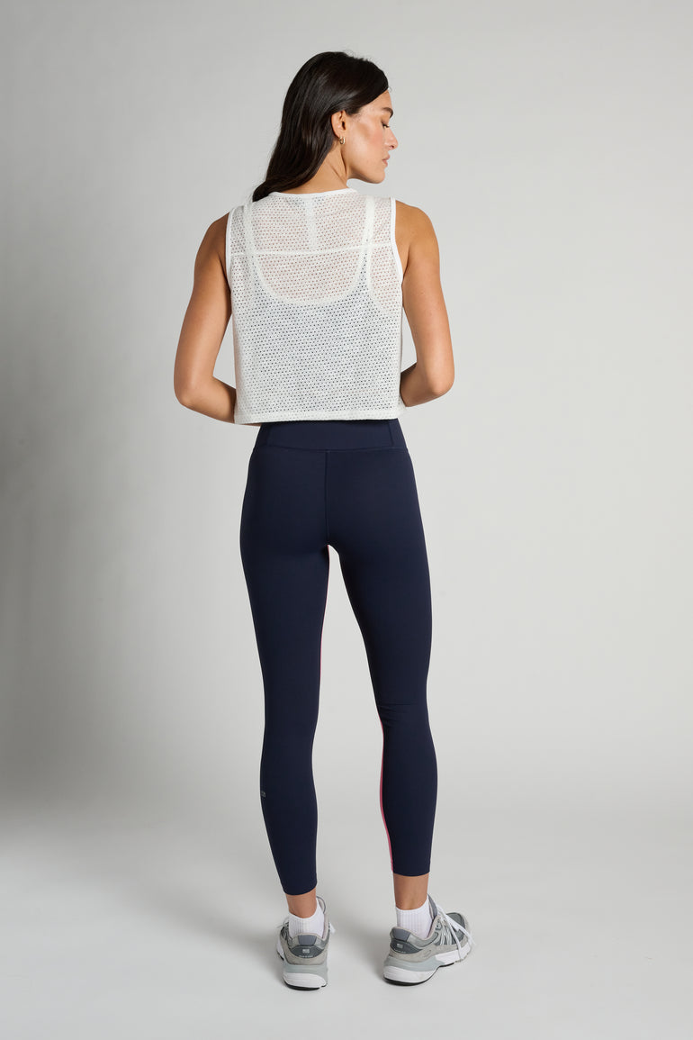 This cropped mesh tank delivers breathable coverage designed for high-sweat sessions. Perfect for layering over a sports bra or tank, it features tonal side stripes for a subtle, elevated finish. Lightweight and airy for effortless performance.