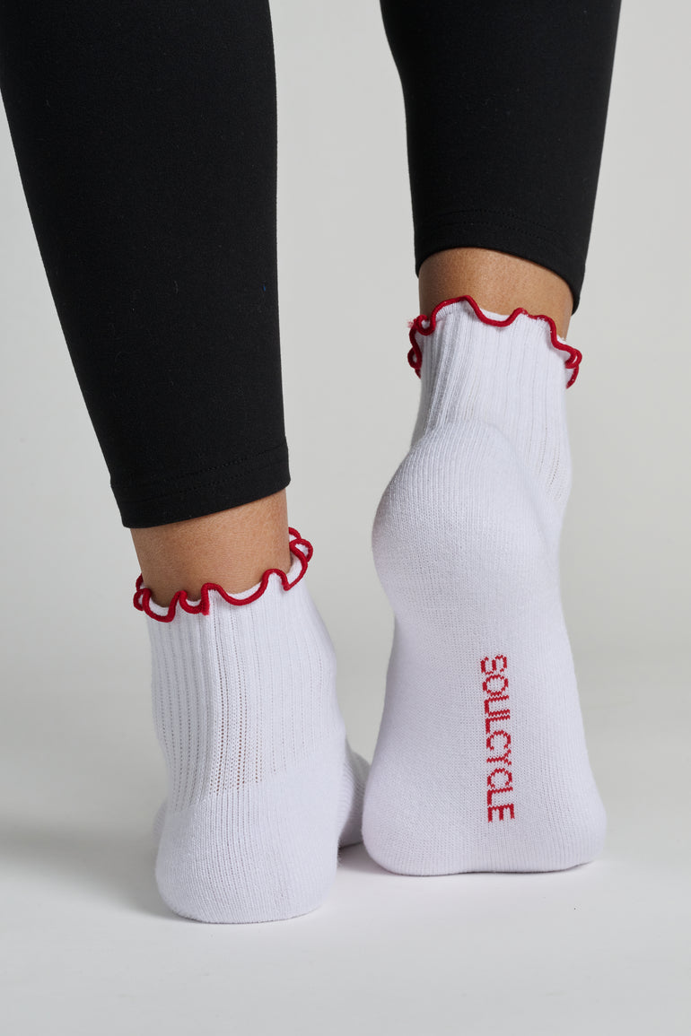Classic quarter-cut socks with a twist. Soft, breathable knit keeps your feet comfortable all day, while a playful red ruffle at the top adds a pop of personality. Perfect for the studio, the street, or anywhere your day takes you.