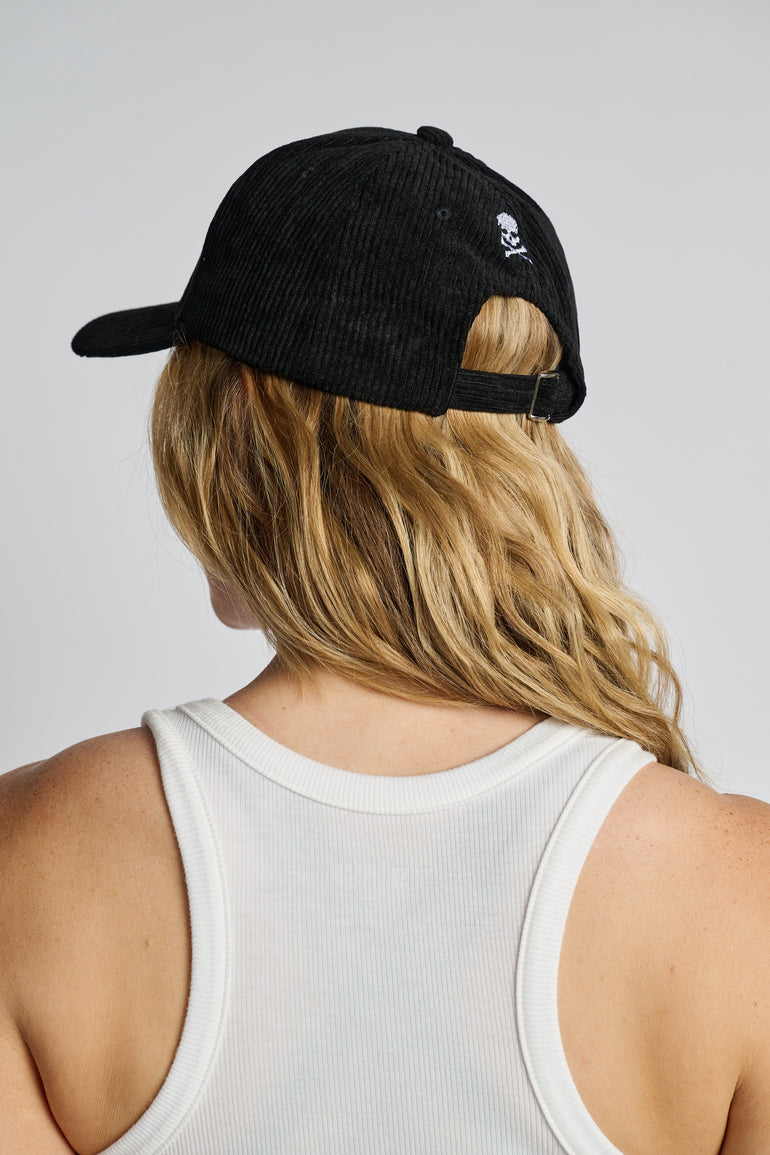 Elevate your everyday look with this corduroy baseball cap, designed for style and comfort on and off the bike. Crafted in soft black corduroy, it features bold “LE RIDE.” embroidery across the front for a statement finish and an adjustable back strap for the perfect fit. A subtle skull-and-crossbones detail at the back adds an edgy touch.