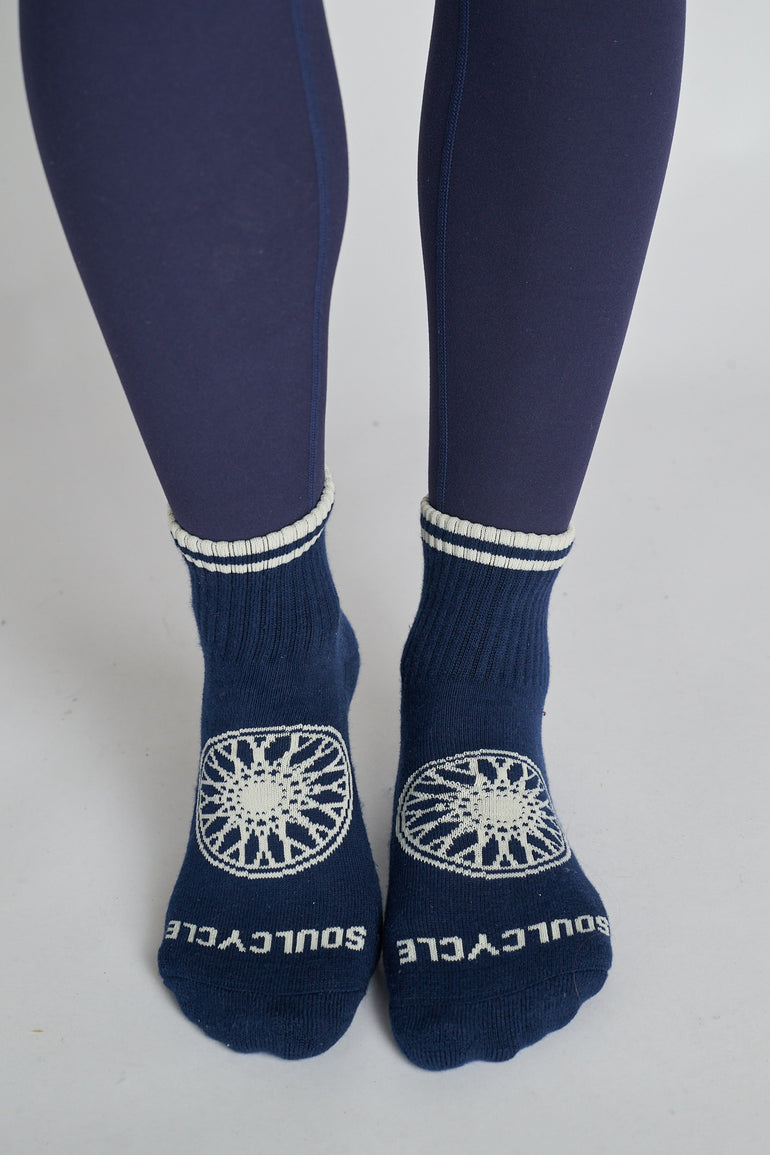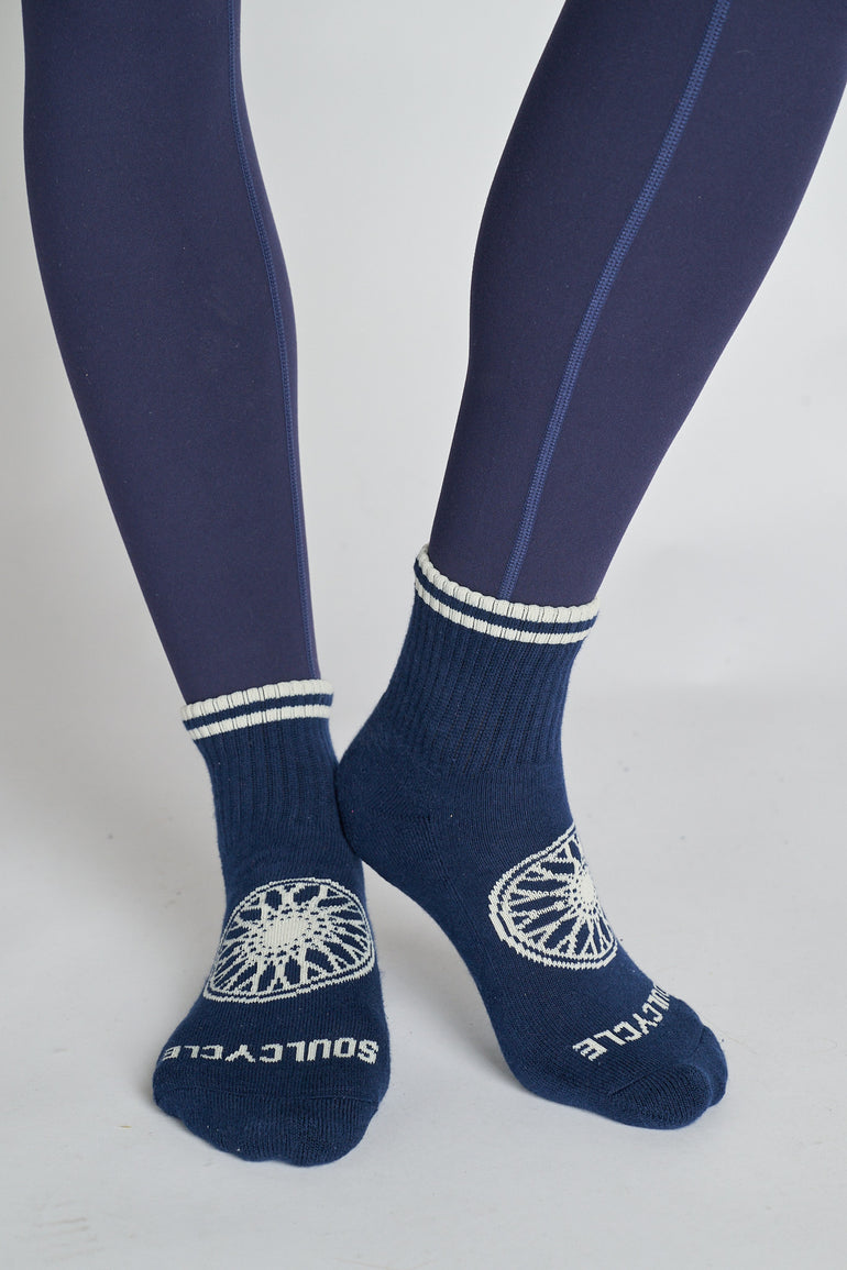 These classic ankle socks bring comfort and style to every stride with a soft, breathable knit and a pop of SoulCycle energy. Designed in deep navy with a clean white wheel graphic and matching white stripe detail, they’re perfect for the studio, the street, and everywhere in between.