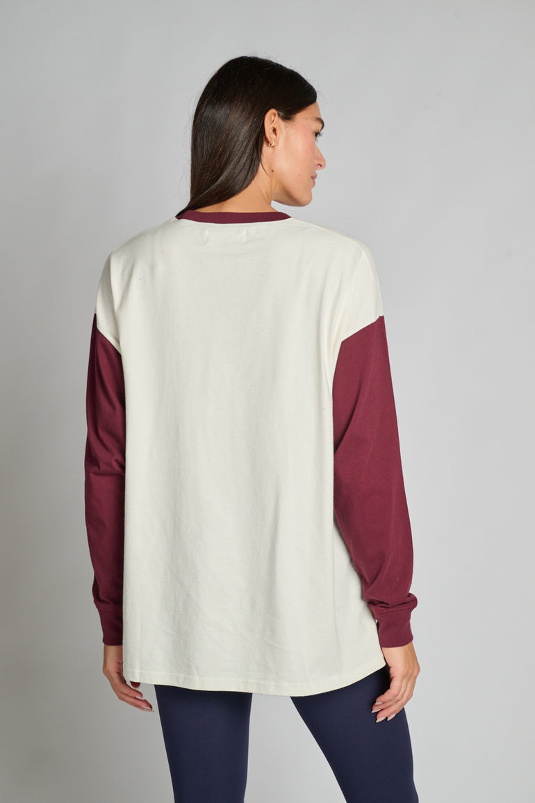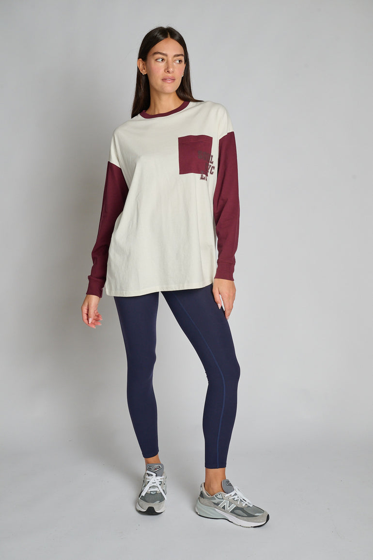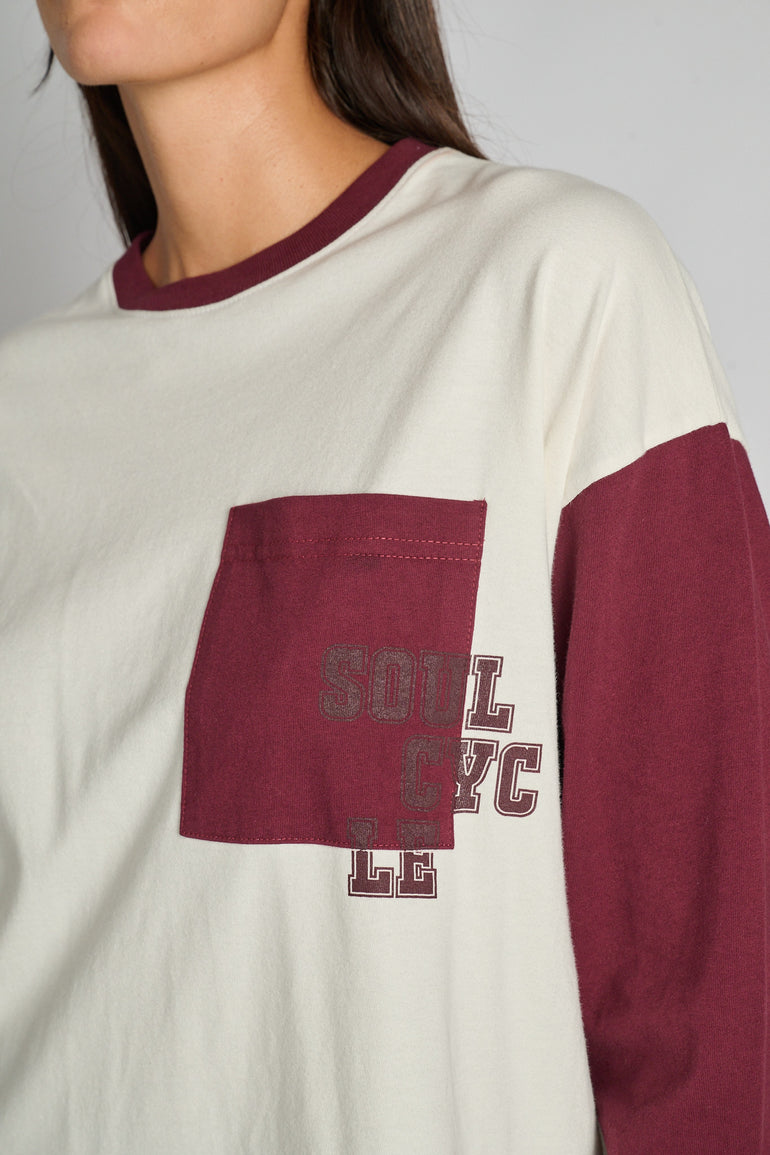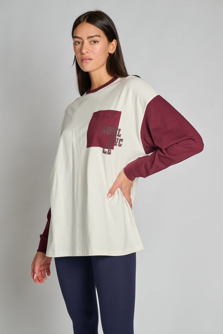 We took our favorite Ruby tee and gave it a cold-weather update. This unisex oversized-fit long-sleeve T-shirt features the same relaxed silhouette you love, now with added warmth and function. Crafted from a heavyweight jersey for structure and a premium hand feel, it’s finished with bold colorblocking for a sporty edge and a chest pocket for everyday utility. The crew neck and dropped shoulders complete its laid-back, contemporary look. Size down for a more traditional fit.