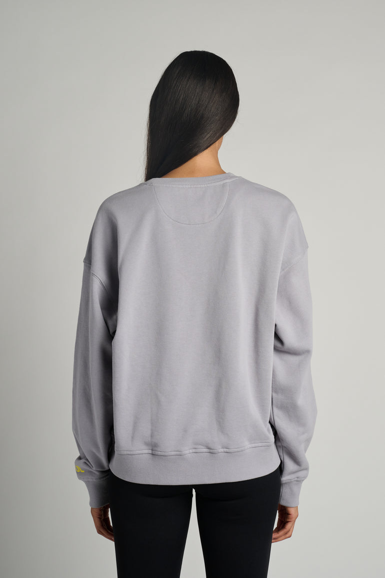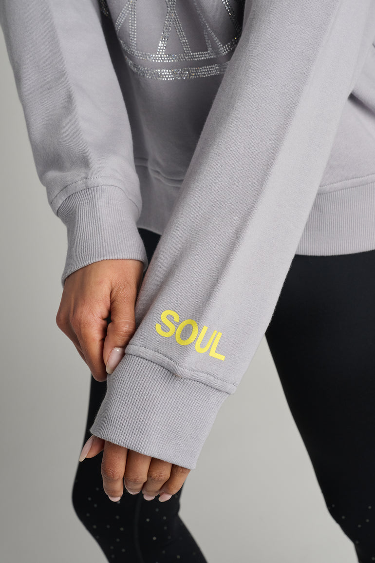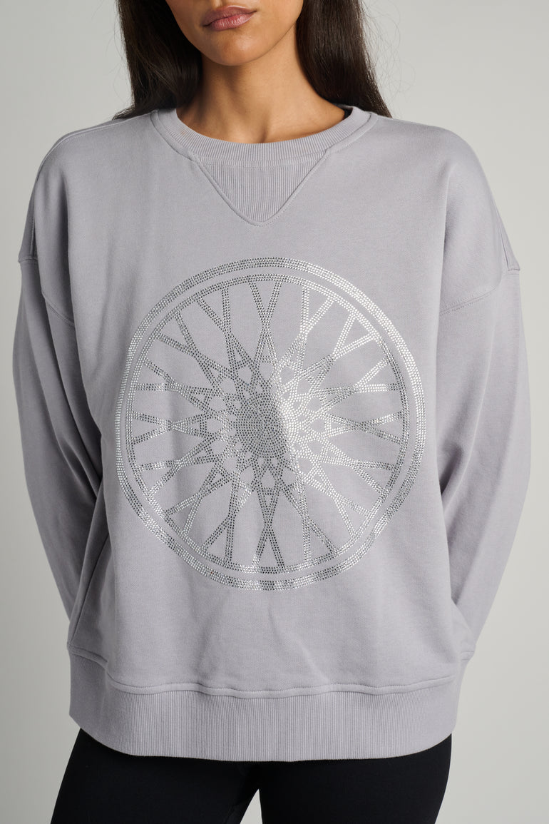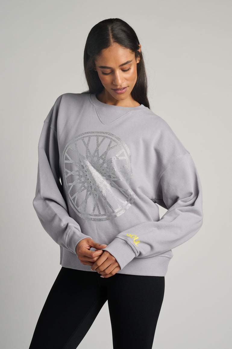 A cozy everyday crewneck with a touch of sparkle. Featuring a rhinestone-studded wheel on the front, it brings a little shine to your studio days and your slow-down moments.