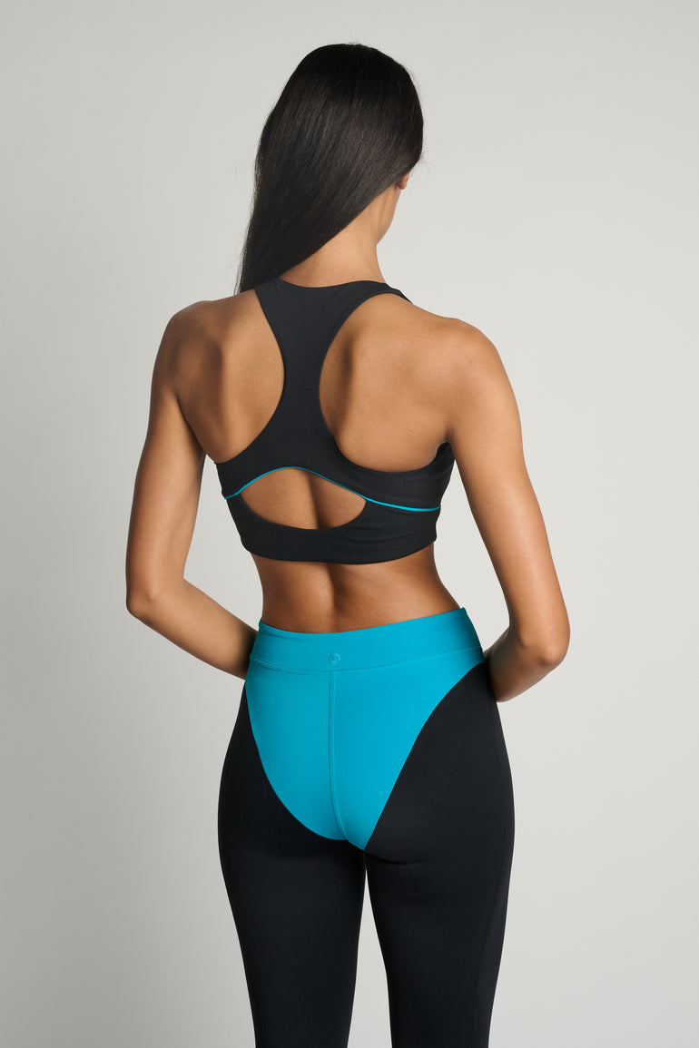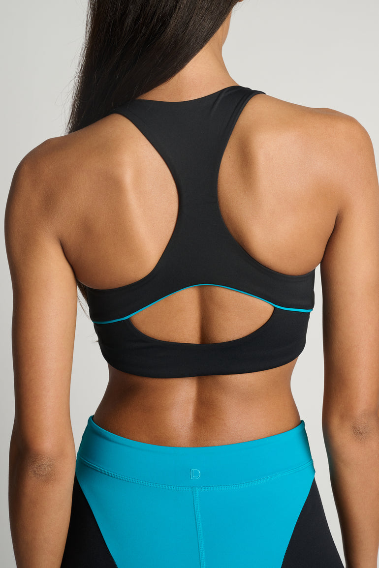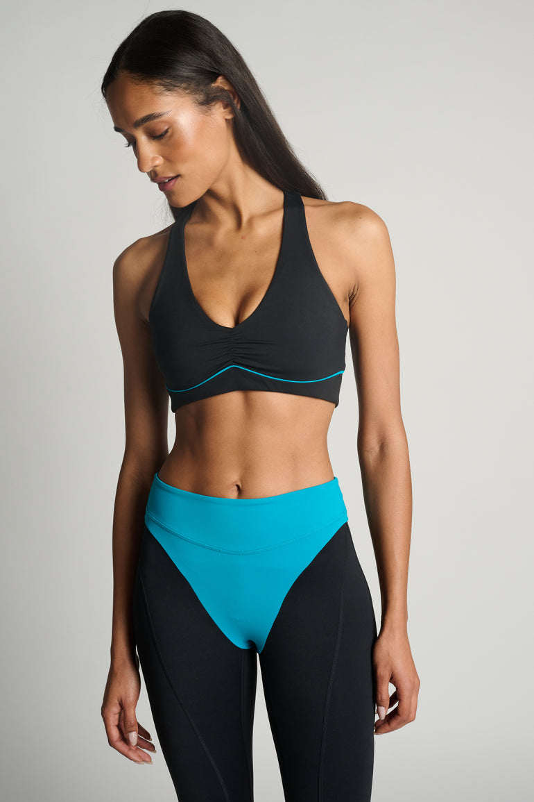 Not your basic sports bra. Designed with a scoop neckline, racerback straps, and contrast piping for a bold, feminine look, this bra blends performance with confidence. A sculpting fit, subtle plunge, and signature ballet pinch elevate the silhouette, while a back cutout adds breathability and style. Made to move and built to support you through everything from low intensity studio days to high impact training.