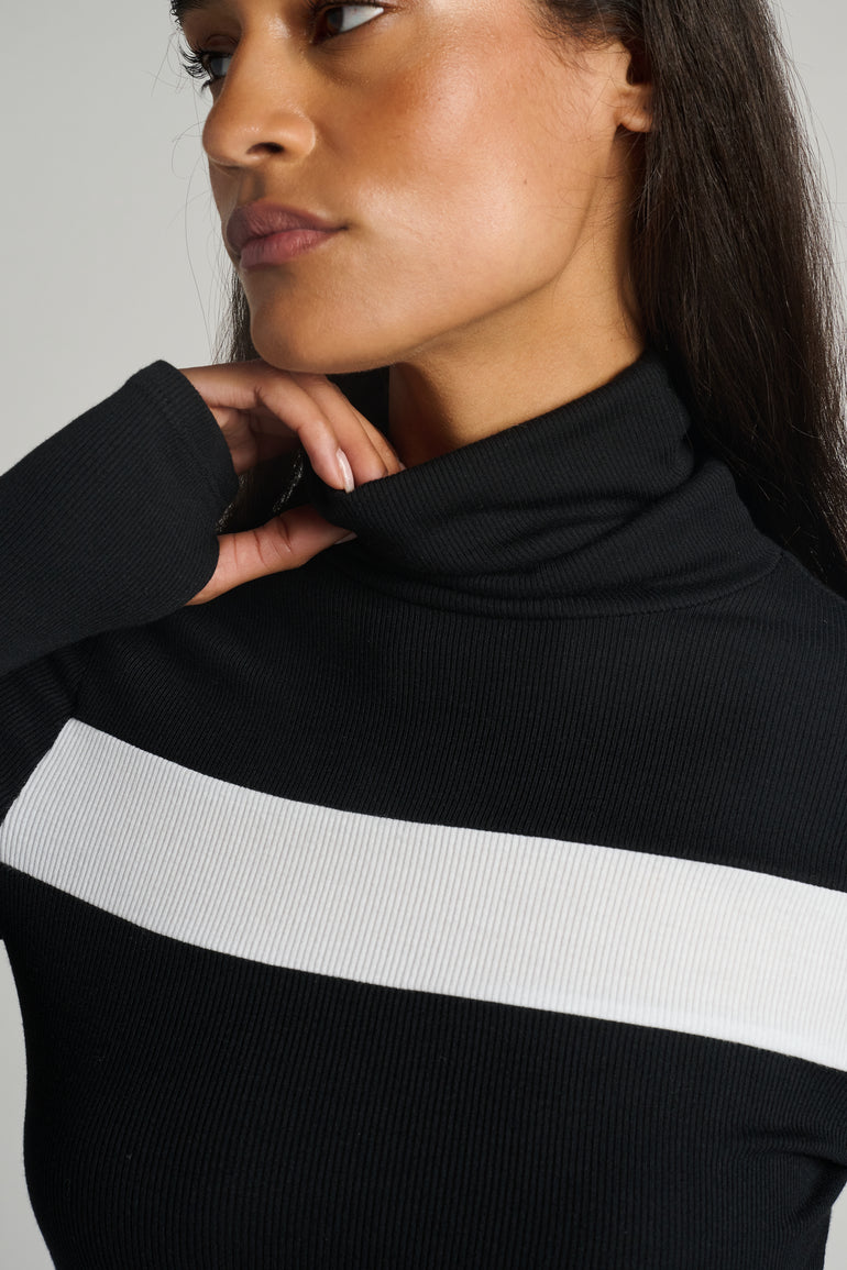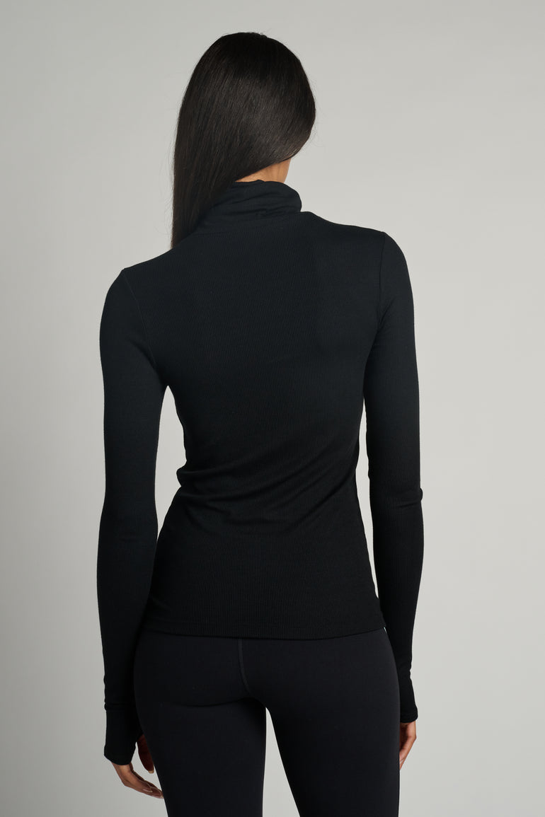 Soft, ribbed turtleneck feels like second skin, offering an ultra soft touch with stretch that moves with you. Hidden thumbholes in the sleeve cuffs help lock in warmth for all-day comfort.
