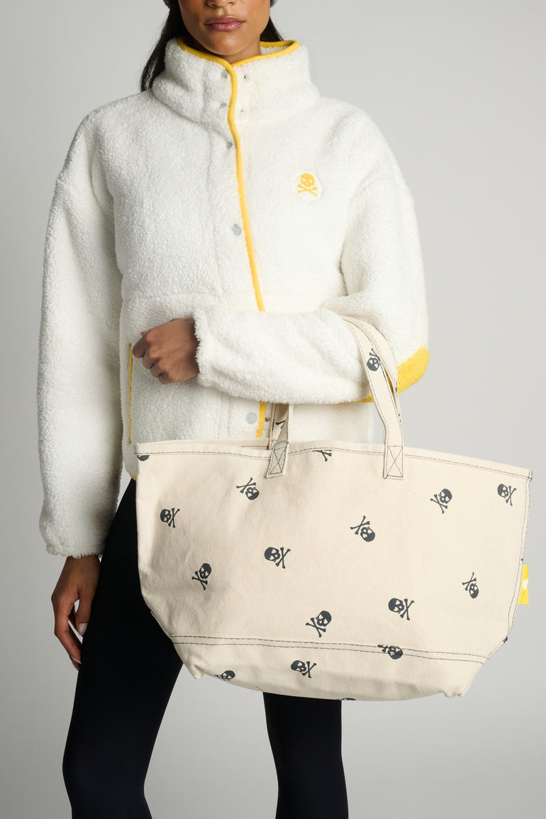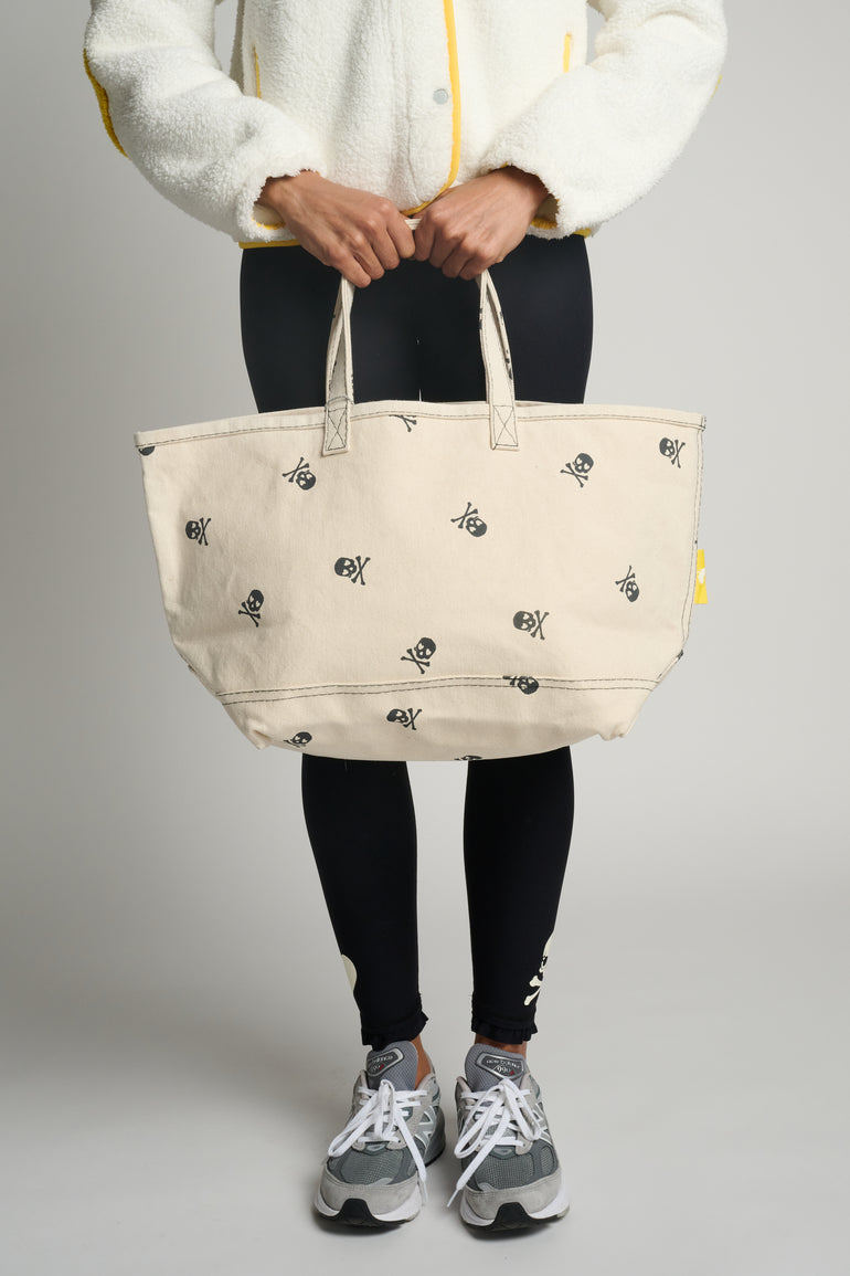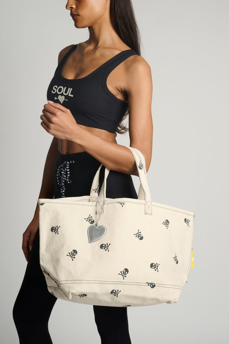 The Soul Tote is a spacious cotton canvas bag in natural cream, scattered with a playful black skull-and-crossbones print. Lightweight and durable, it’s perfect for carrying your essentials from the studio to weekend adventures while adding a bold, edgy touch to any outfit.