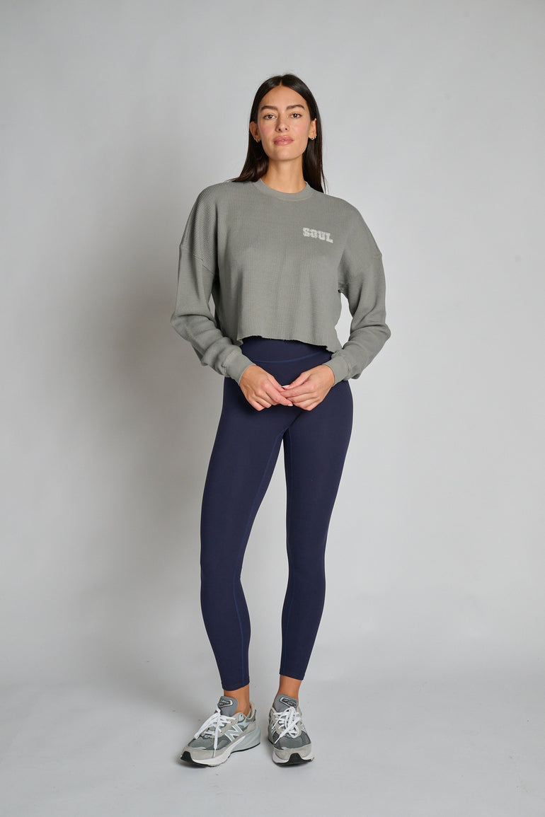 Effortless comfort meets everyday style in this cropped women’s crew neck long sleeve. Crafted from soft waffle fabric, this piece is perfect for layering through the seasons. With dropped shoulders and a relaxed fit, it offers an easy, laid-back silhouette ideal for both pre- and post-workout errands or casual weekends. Whether worn alone or layered under jackets and hoodies, this versatile piece is a go-to for comfort and style all day long.