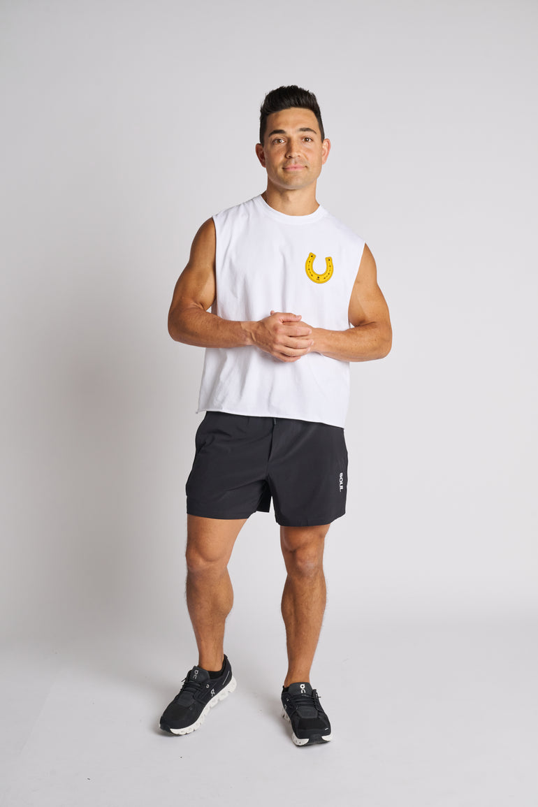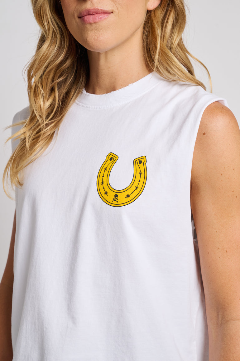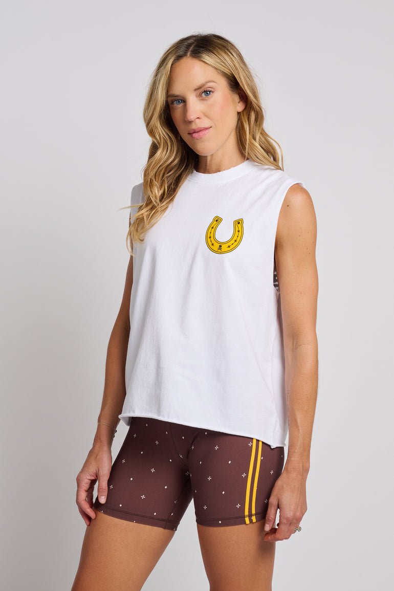 This effortlessly cool, laidback muscle tank is your go to top for hot summer days. Crafted from soft cotton, it features a boxy silhouette that drapes just right for a relaxed, unstructured fit. Featuring an unfinished hem and subtle neckline distressing, this tank adds a touch of worn-in edge while delivering carefree comfort.