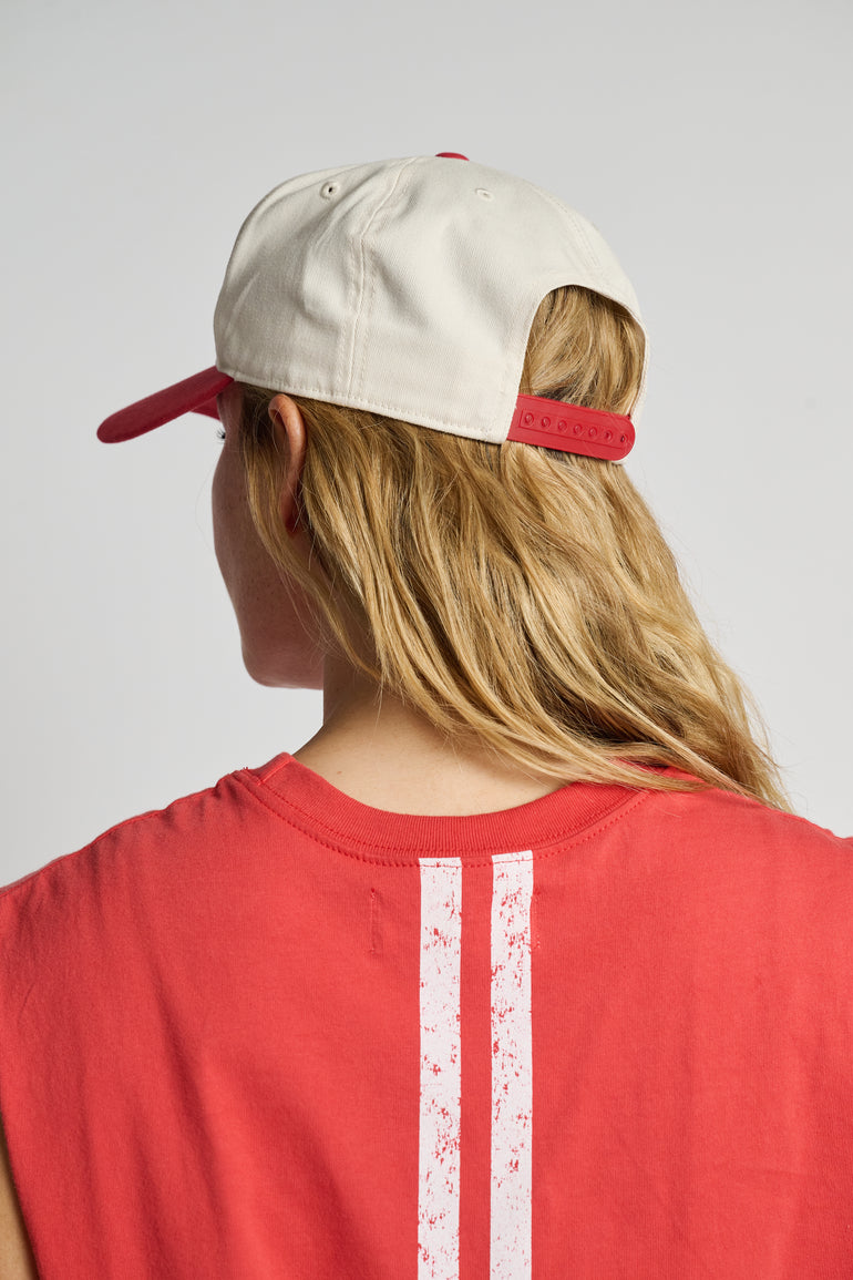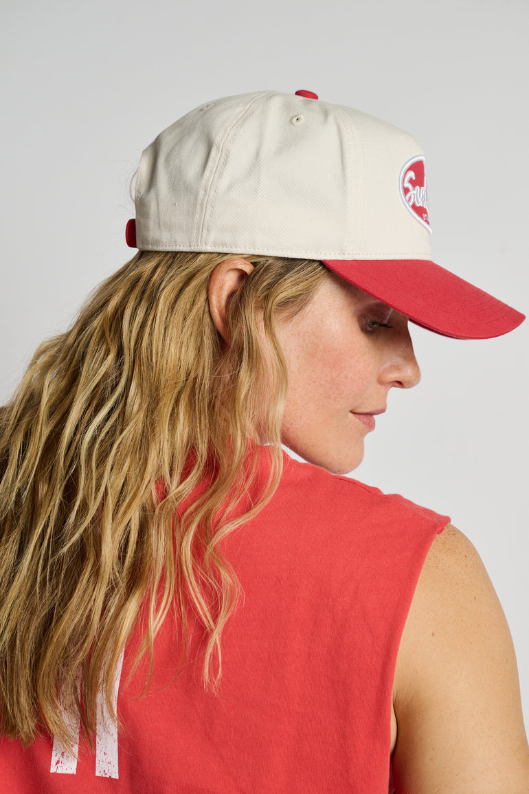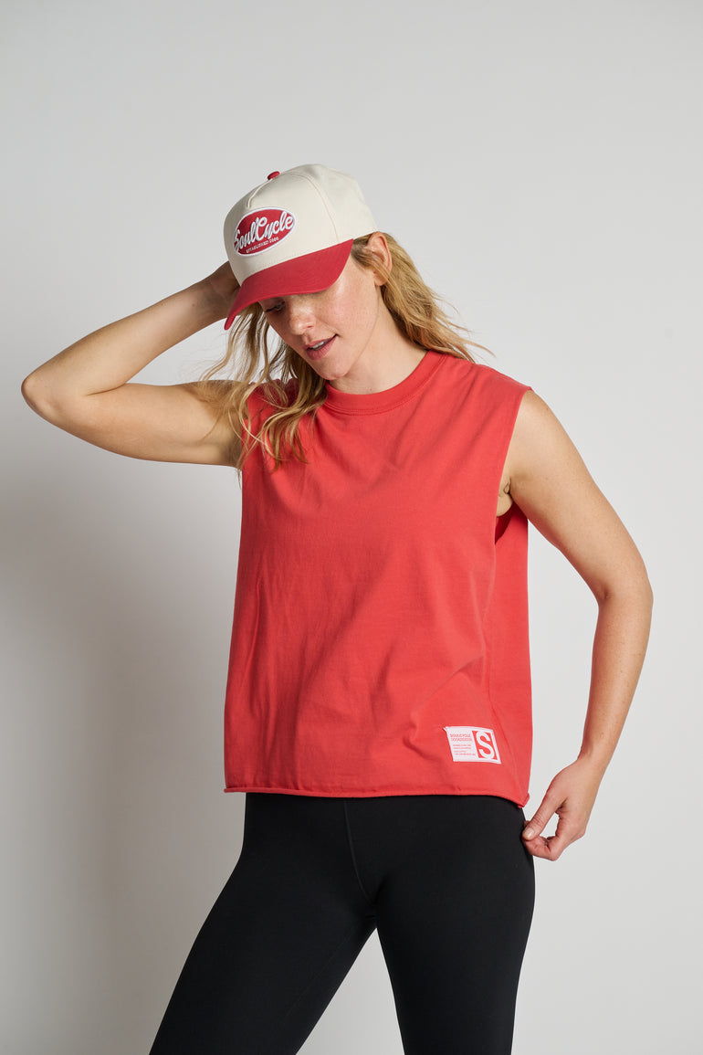 A classic two-tone design with a white crown and red brim, this hat features the embroidered SoulCycle logo front and center. Built with durable construction and a breathable fit, it’s finished with an adjustable back closure for a custom feel. The perfect piece to take you from the studio to the street.