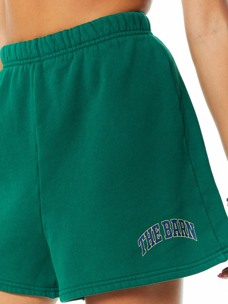 Lounge in style with these soft and stylish shorts. Designed with an elastic-waistband for comfort, two side slit pockets to store all your on-the-go needs, plus a curved hem for a breathable and flattering fit. Features blue "THE BARN" on left leg hem. Made in L.A.