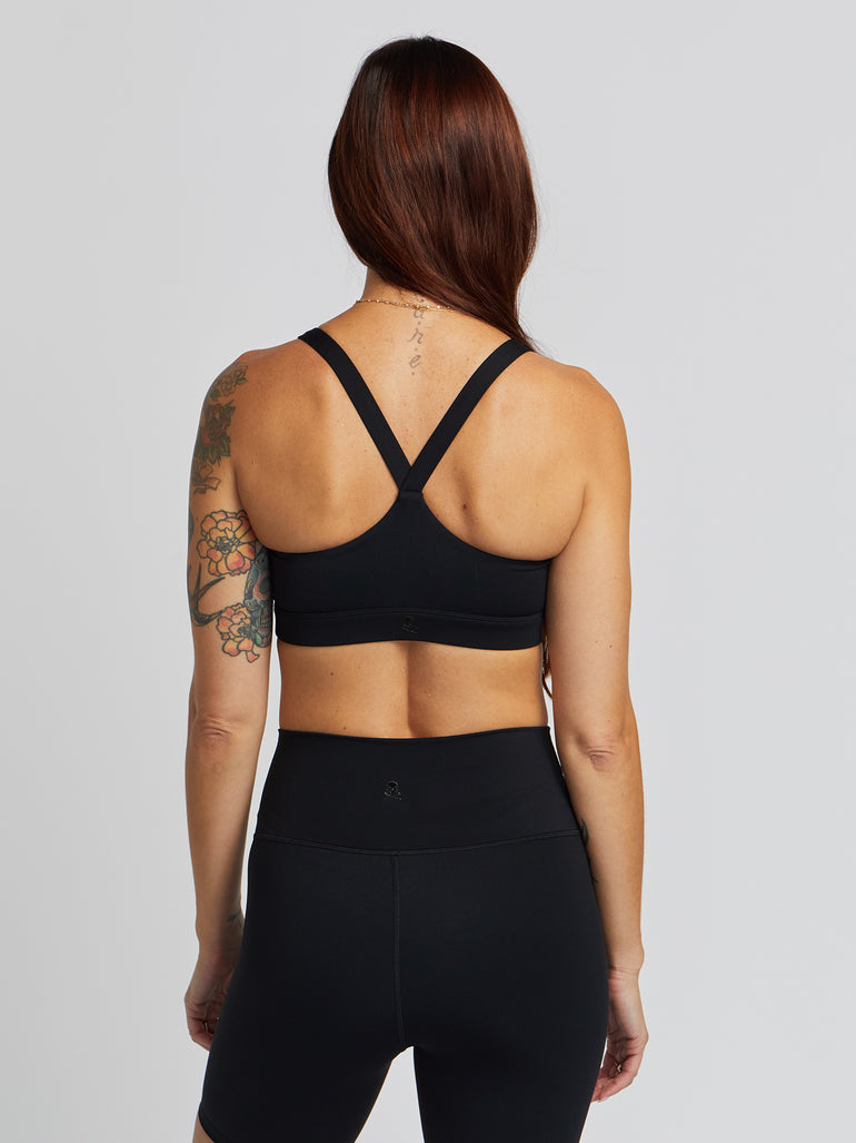 This bra is designed with the ride in mind. With a soft scoop neck and thin straps, this is the perfect-medium support bra for sweating, dancing, and riding to the rhythm. Does not come with padding.