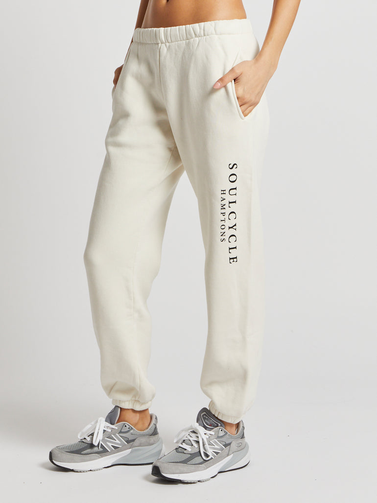 Our basic Billie Unisex Sweatpant in black features a relaxed fit with convenient pockets. A "SOULCYCLE- HAMPTONS" graphic is boldly displayed along the left leg.