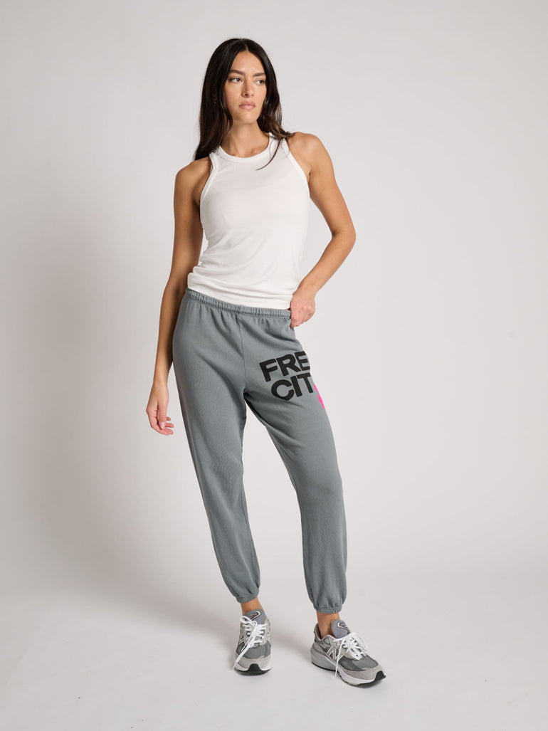 This unisex sweatpant is hand-sewn and hand-screen printed locally in Los Angeles for an 100% custom garment. Designed in a relaxed fit with covered elastic waistband and pull drawcord. Features FREECITY print with a dove on left thigh. Made in U.S.A.