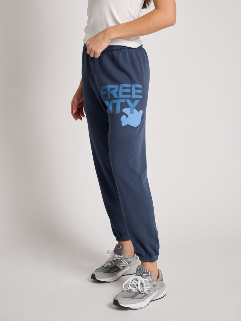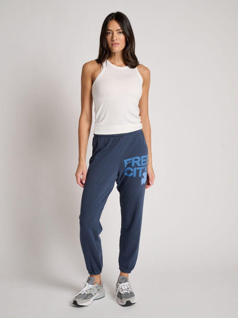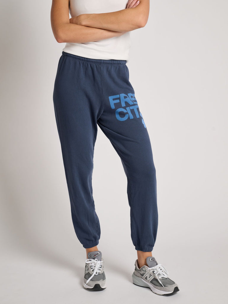 This unisex sweatpant is hand-sewn and hand-screen printed locally in Los Angeles for an 100% custom garment. Designed in a relaxed fit with covered elastic waistband and pull drawcord. Features FREECITY print with a dove on left thigh. Made in U.S.A.