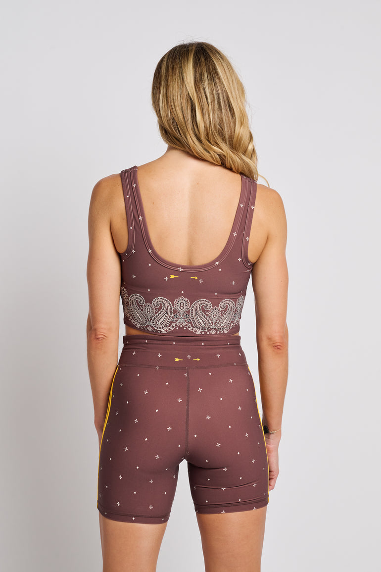A mid-coverage crop top in soft recycled peached fabric, featuring a chocolate paisley border print, a scoop neckline, and an internal shelf bra with removable cups. Designed with a printed arrow logo at the back, this breathable, moisture-wicking style is quick drying and extra soft to the touch.