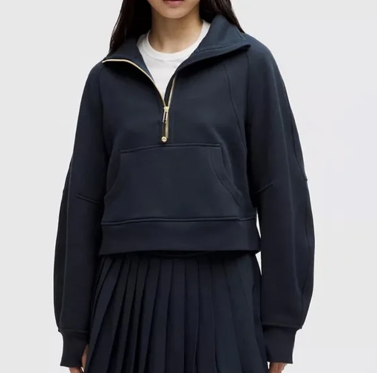 Designed for casual and serious about softness. This funnel-neck sweatshirt is all about plush, fleecy fabric. An exaggerated fit that feels extra roomy. Not too short, not too long, just right around the waistband. Kangaroo pocket has hidden phone sleeve. Elastic zipper pull doubles as an emergency hair tie.